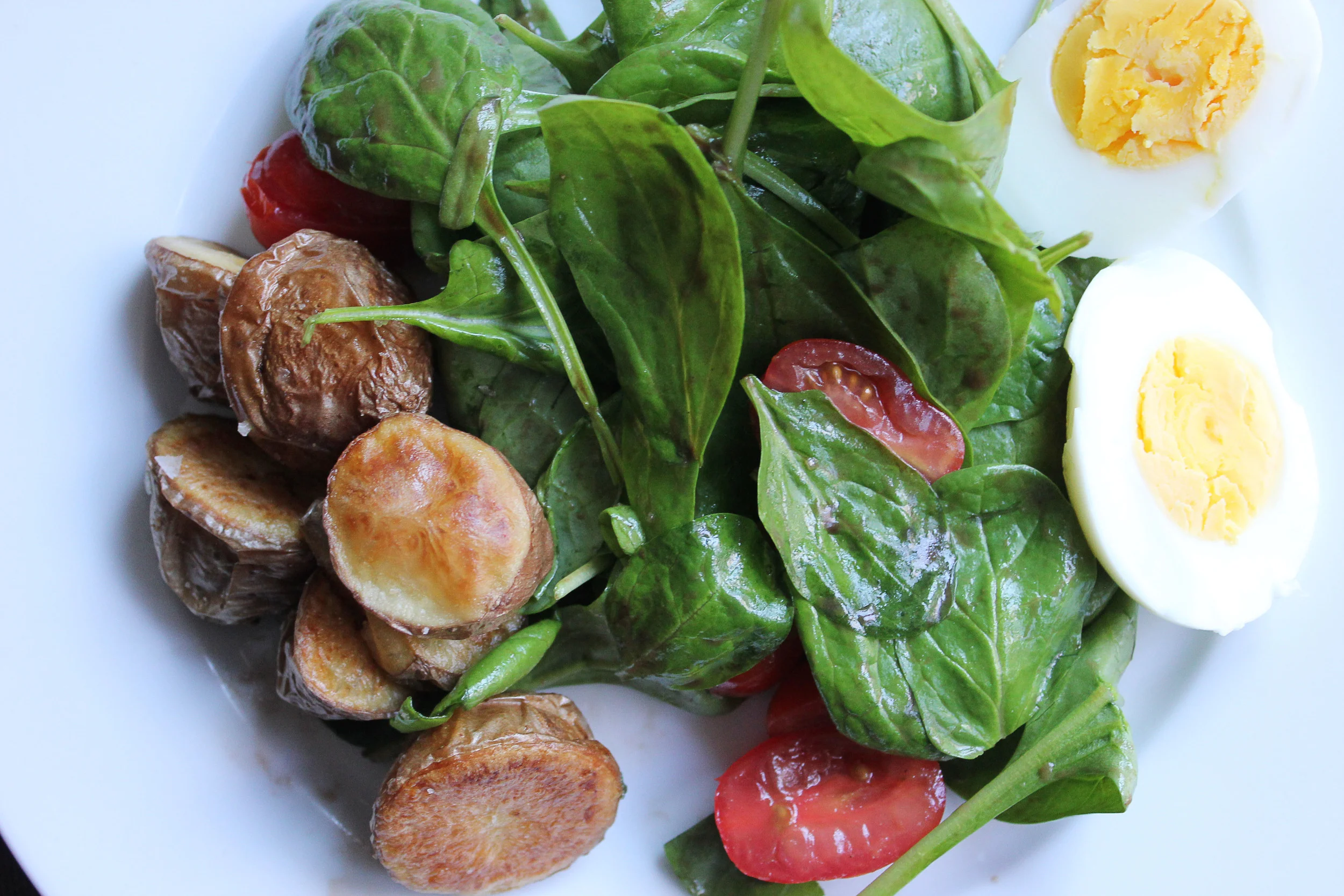 While at the market I noticed some crisp spinach, red potatoes, and cherry tomatoes and decided to whip up a paired down version of salad niçoise. That qualifies as healthy right? Traditional niçoise typically has green beans, tuna, anchovy, olives and a few other goodies.